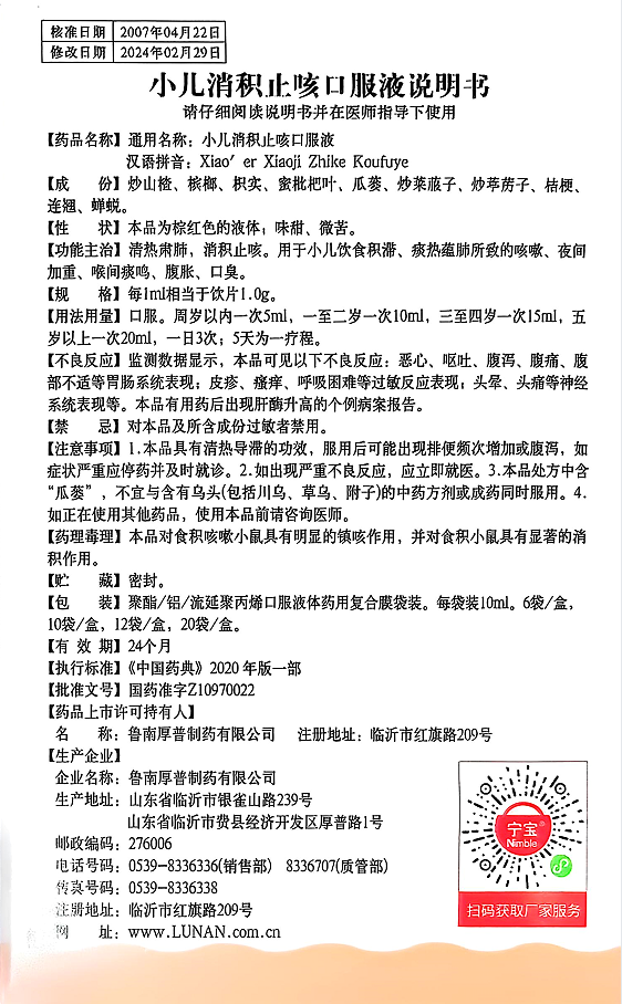 【功能主治】清热肃肺,消积止咳。用于小儿饮食积滞、痰热蕴肺所致的咳嗽、夜间加重、喉间痰鸣、腹胀、口臭。