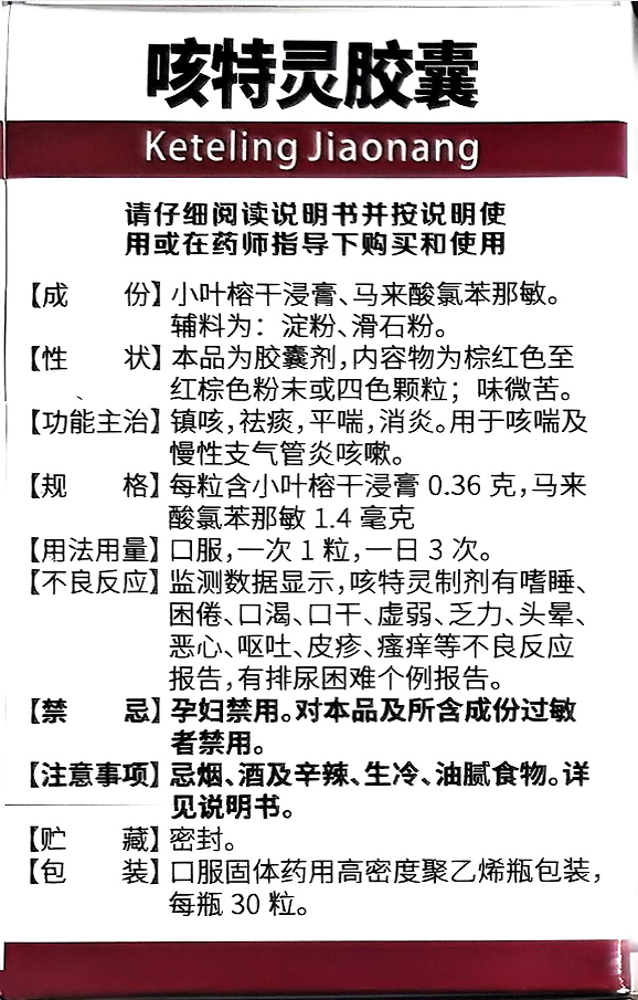【不良反应】监测数据显示,咳特灵制剂有嗜睡、困倦、口渴、口千、虚弱、乏力、头晕、恶心、呕吐、皮疹、瘙痒等不良反应报告,有排尿困难个例报告。