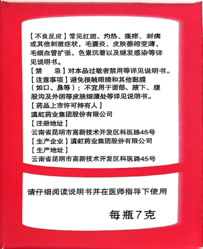 【不良反应】常见红斑、灼热、、刺或其他刺激症状,毛霸炎、皮肤葵给亚薄,毛细血管扩张、色素沉着以及继发感染等详见说明书。