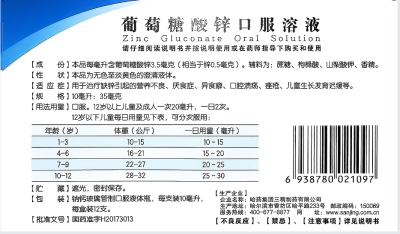 【主要成份】本品每毫升含葡萄糖酸锌3.5毫克(相当于锌0.5毫克)。辅料为:蔗糖、枸橼酸、山梨酸钾、香精。